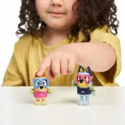 Zabawa na basenie jest zestawem dwóch ruchomych figurek piesków. Ubrana w strój kąpielowy Bluey jest gotowa na wodną zabawę. Nałóż pieskom gogle pływackie i hop do
