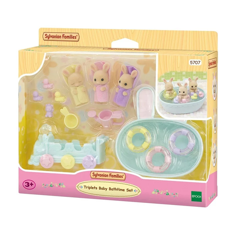 Zestaw Kąpiel trojaczków Sylvanian Families zawiera małe, urocze figurki zwierzątek pokryte mięciutkim, aksamitnym futerkiem. Trojaczki z rodziny biszkoptowych królików Isla, Iris i Owen cieszą się, kiedy nadchodzi dzień kąpieli. Isla uwielbia pluskać się w wannie, Iris to wielki śpioch i potrafi zasnąć nawet w wannie, Owen uwielbia pociągi. Czasami nie ma ochoty na kąpiel, wtedy mama wkłada do wanny jego pociąg i Owen natychmiast zmienia zdanie. W pociągu jest miejsce dla całej trójki. Mama wkłada do wanny również kółka do pływania i kąpielowe kaczuszki. Figurki i akcesoria można połączyć z innymi zestawami, domkami, pojazdami i akcesoriami Sylvanian Families. Zabawki Sylvanian Families wyróżnia najwyższa jakość wykonania oraz wyjątkowa dbałość o szczegóły. Figurki mają ruchome główki, rączki i nóżki. Polecamy dla dzieci od 3 roku życia.