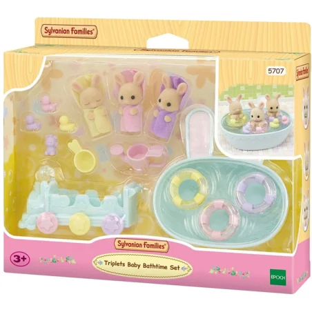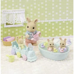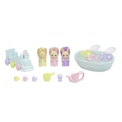 Zestaw Kąpiel trojaczków Sylvanian Families zawiera małe, urocze figurki zwierzątek pokryte mięciutkim, aksamitnym futerkiem. Trojaczki z rodziny biszkoptowych królików Isla, Iris i Owen cieszą się, kiedy nadchodzi dzień kąpieli. Isla uwielbia pluskać się w wannie, Iris to wielki śpioch i potrafi zasnąć nawet w wannie, Owen uwielbia