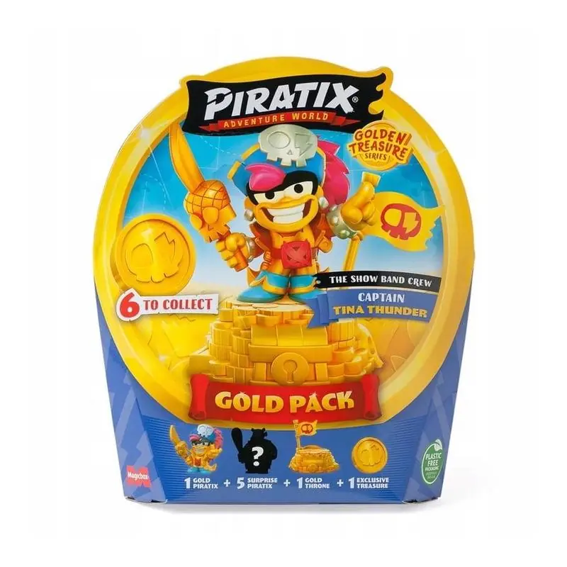Baw się Piratiksami i powiększ swoją kolekcję za pomocą zestawu Gold Pack. Zawiera on 6 figurek Piratix i 6 akcesoriów, a także jednego ze złotych kapitanów z ekskluzywną banderą i skarbem oraz podium w złotym kolorze dostępnym wyłącznie w tym zestawie.