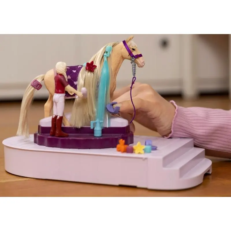 SCHLEICH Sofia’s Obrotowa Stacja Pielęgnacji Koni 42617 to rozbudowany zestaw, który wspiera rozwój wyobraźni, uczy odpowiedzialności oraz bezpiecznej opieki nad zwierzętami. Model został zaprojektowany z dbałością o detale, dzięki czemu oferuje realistyczne doświadczenia związane z pielęgnacją koni i światem jeździeckim.