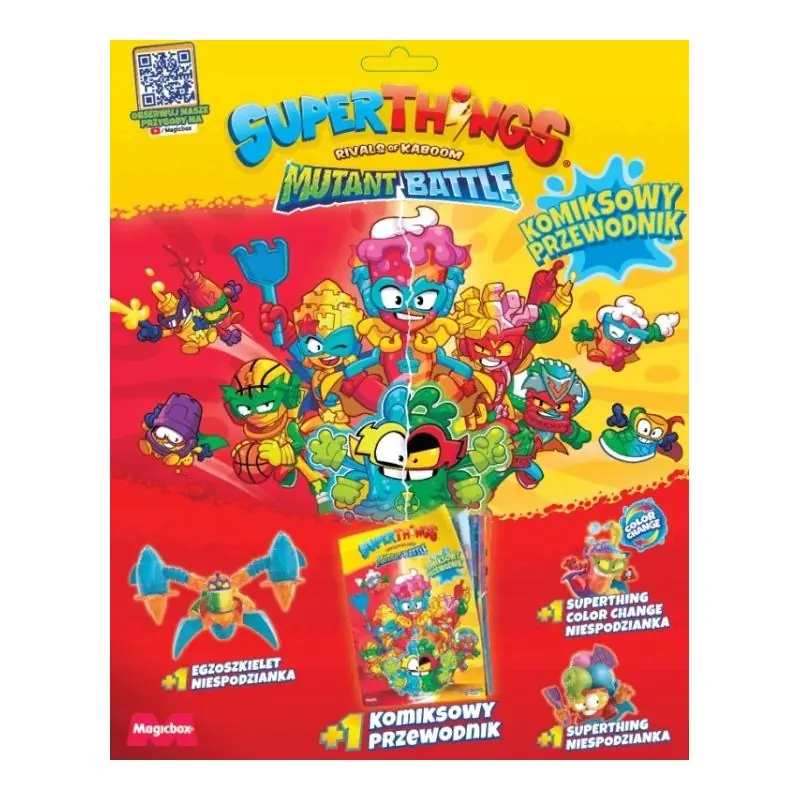 W zestawie znajdziesz 24-stronicowy komiksowy przewodnik, który wprowadzi Cię do świata serii Mutant Battle. Poznasz historię Kazoom Kids oraz ultrarzadką postać. Znajdziesz też opisy mocy poszczególnych SuperThingsów oraz możliwości egzoszkieletów.