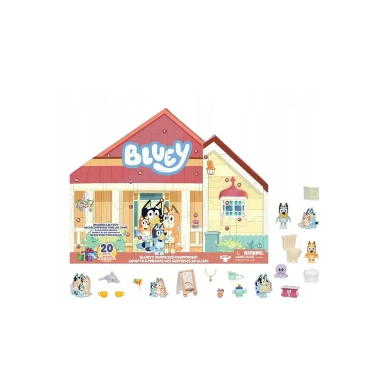 Kalendarz zawiera 20 okienek z niespodziankami, w tym figurki i akcesoria z postaciami Bluey.