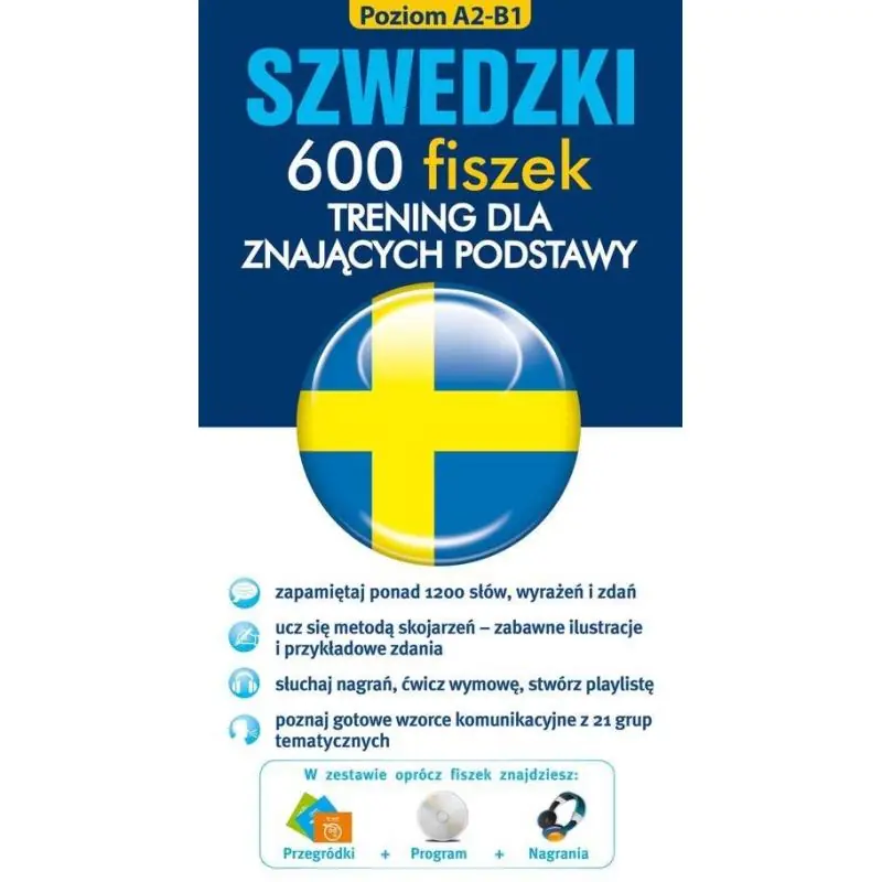 Dzięki nauce z fiszkami: - poznasz 600 wyrażeń i zwrotów, dzięki którym zaczniesz swobodnie rozmawiać, - szybko i skutecznie opanujesz słownictwo z 21 grup tematycznych, - posłuchasz gotowych nagrań i przećwiczysz wymowę, - wygenerujesz własną playlistę na odtwarzacz mp3 lub telefon i powtórzysz słówka za lektorem, - utrwalisz wiedzę za pomocą kolorowych przegródek i testów, - będziesz ćwiczył język o każdej porze i w dowolnym miejscu. Szwedzki 600 fiszek Trening dla znających podstawy to zestaw, który zawiera: 600 fiszek, płytę z nagraniami i programem oraz kolorowe przegródki. Aby ułatwić zapamiętywanie materiału metodą skojarzeń, wybrane fiszki uzupełniono zabawnymi ilustracjami, a kurs podzielono na 21 grup tematycznych. Dodatkowo dołączono program z ćwiczeniami i testami do powtórki materiału. Kurs przeznaczony jest dla osób, które opanowały podstawy języka szwedzkiego. Do kursu dołączono program Aktywny Trening z ćwiczeniami, który umożliwia tworzenie indywidualnych list nagrań słów i zdań, odsłuchiwanie ich na dowolnym odtwarzaczu i głośne powtarzanie za lektorem. Dzięki funkcji karaoke możesz sprawdzić na ekranie wyświetlacza prawidłową pisownię słów, a rozwiązując testy, aktywnie sprawdzić stopień opanowania materiału z fiszek i skutecznie utrwalić znajomość słownictwa. Kurs językowy z fiszkami to nie tylko skuteczna metoda aktywnego przyswajania niemieckiego słownictwa, ale również wygodny i atrakcyjny sposób na naukę w dowolnej chwili i czasie: w drodze do pracy, szkoły, w podroży czy na spacerze.