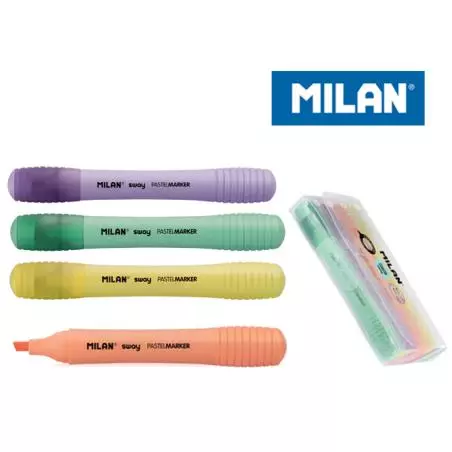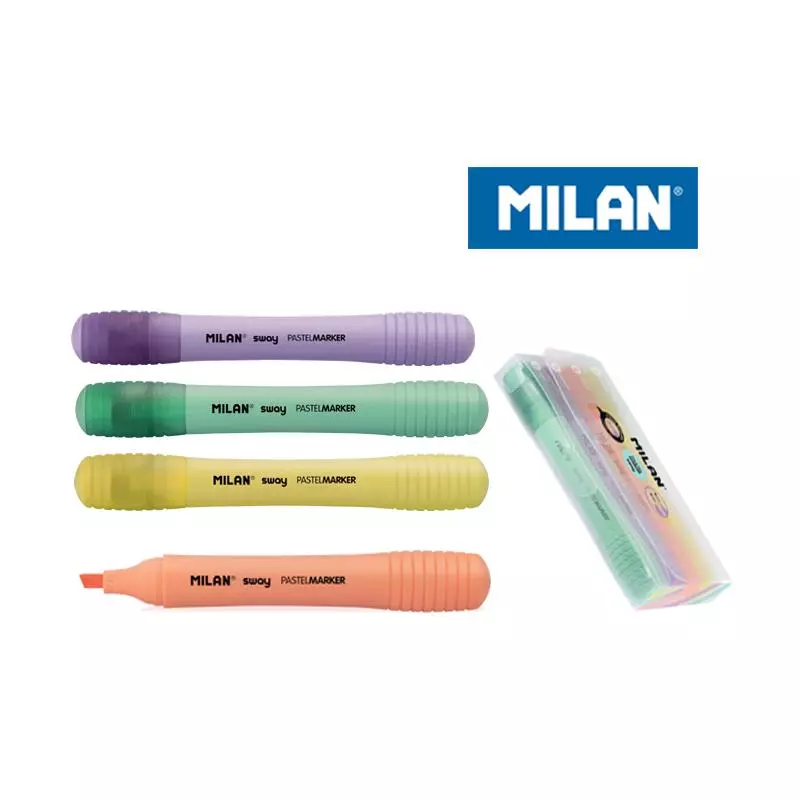 Zakreślacze pastelowe MILAN, płaskie ze ściętą końcówką. W zestawie 4 kolory w przezroczystym etui, grubość pisania: 2-4 mm. Wysokiej jakości tusz. Zamknięcie z systemem bezpieczeństwa, który zapobiega wysychaniu zakreślacza.