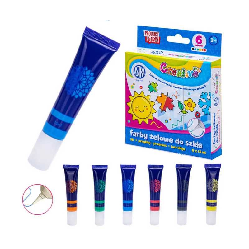 - Farby żelowe do tworzenia witraży na szybach, po wyschnięciu tworzy się żelowa „naklejka” statyczna, którą można przenosić