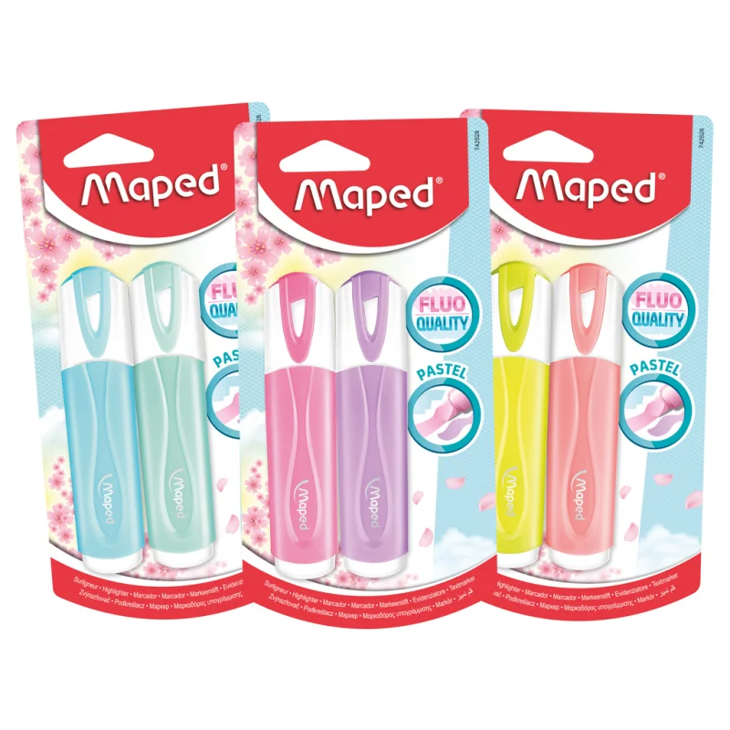 Zakreślacz FLUO'PEPS PASTEL. Klasyczny kształt obudowy. Tusz nietoksyczny o wysokiej wydajności i trwałości, odporny na działanie światła. Do wszystkich papierów standardowych, samokopiujących, fotokopii, termopapierów i papierów faksowych. Pozostawione bez skuwki nie tracą swoich właściwości nawet po 4 godzinach. Ścięta końcówka umożliwia pisanie cienką i grubą linią, od 1 do 5 mm. Blister zawiera 2 sztuki, mix kolorów. Kolor wysyłany losowo.