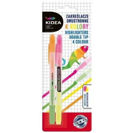 Zakreślacze Kidea to funkcjonalne narzędzie 2w1, które pozwala na precyzyjne i szybkie zaznaczanie informacji. Kompaktowy zestaw 4 kolorów ułatwia kolorystyczne kodowanie notatek, wspierając efektywną naukę i organizację pracy.
