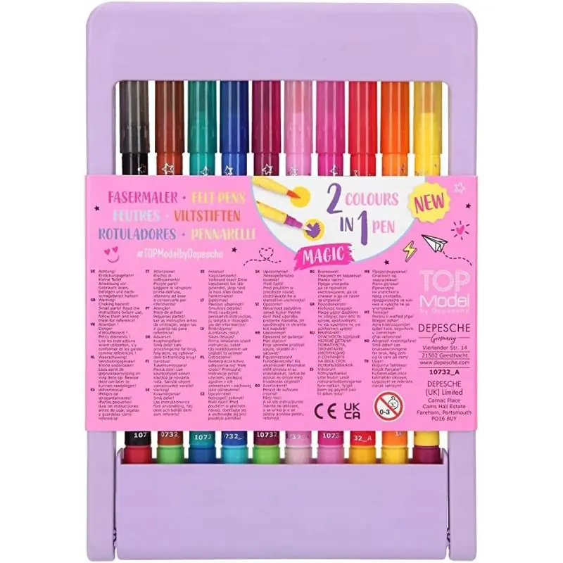 Magiczne flamastry Depesche Top Model to kreatywny zestaw dwustronnych pisaków, który pozwala tworzyć efektowne rysunki i napisy z funkcją zmiany koloru. Produkt został zaprojektowany z myślą o dzieciach oraz młodzieży, które lubią rysowanie, kolorowanie i projektowanie w stylu Top Model.