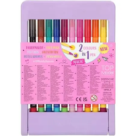 Magiczne flamastry Depesche Top Model to kreatywny zestaw dwustronnych pisaków, który pozwala tworzyć efektowne rysunki i napisy z funkcją zmiany koloru. Produkt został zaprojektowany z myślą o dzieciach oraz młodzieży, które lubią rysowanie, kolorowanie i projektowanie w stylu
