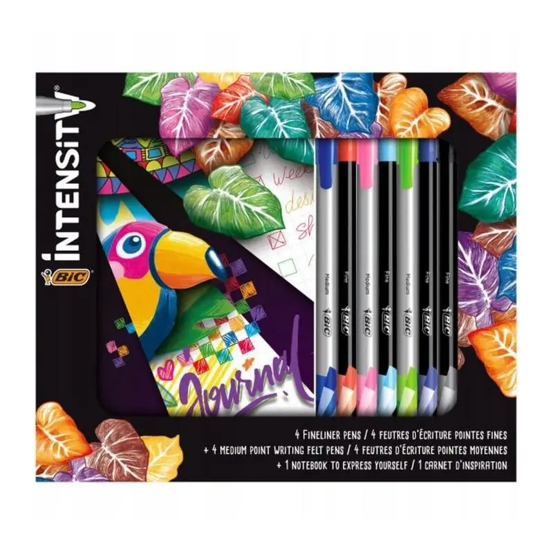 Zestaw piśmienniczy BIC Intensity z notesem i cienkopisami w 8 kolorach to praktyczny komplet do codziennego notowania, planowania, rysowania i tworzenia kolorowych akcentów w notatkach. Wysokiej jakości cienkopisy zapewniają precyzyjną linię i intensywne barwy, a notes stanowi wygodną