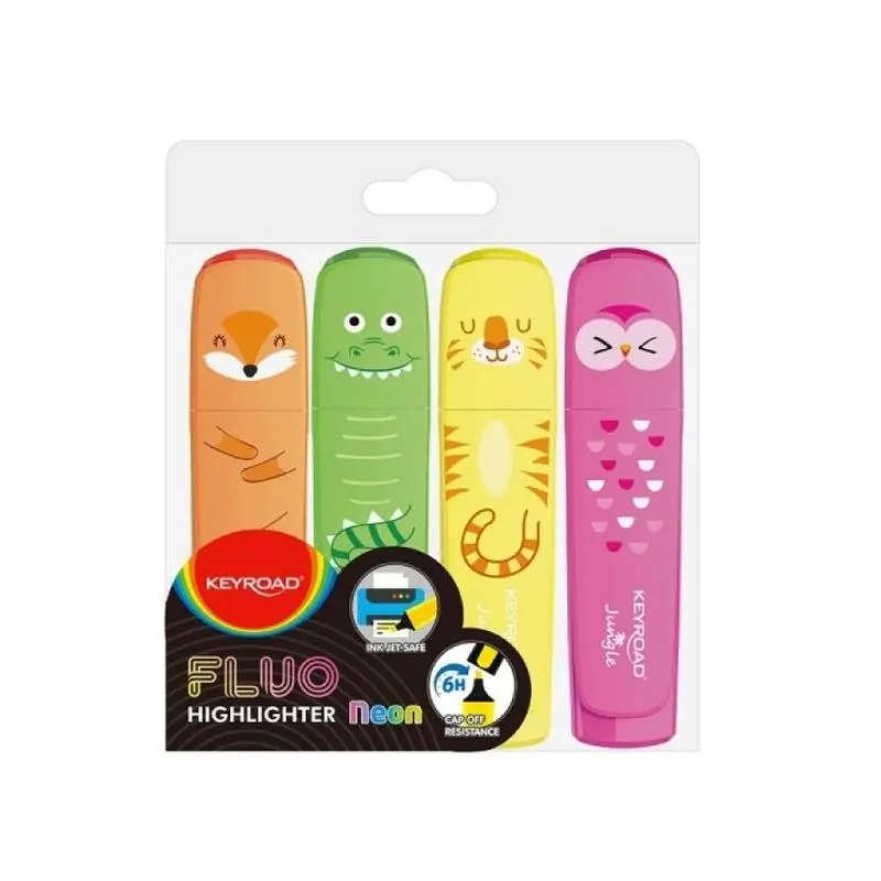 Zakreślacze KEYROAD Fluo Jungle 1–5 mm 4 szt. w etui to praktyczny zestaw do codziennego wyróżniania tekstu. Wyraziste kolory, ścięta końcówka i wygodne etui sprawiają, że produkt idealnie sprawdzi się w szkole, na studiach i w biurze.