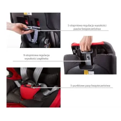 - 9-stopniowa regulacja zagłówka: dopasowuje się do wzrostu dziecka, zapewniając optymalną ochronę głowy i szyi.