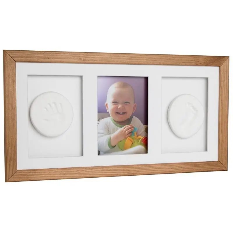 Uchwyć najpiękniejsze wspomnienia z pierwszych miesięcy życia Twojego dziecka dzięki eleganckiej potrójnej ramce z glinką. To wyjątkowa pamiątka, która pozwala utrwalić odcisk małych rączek i stópek niemowlęcia, a także umieścić zdjęcie maluszka w centralnej części