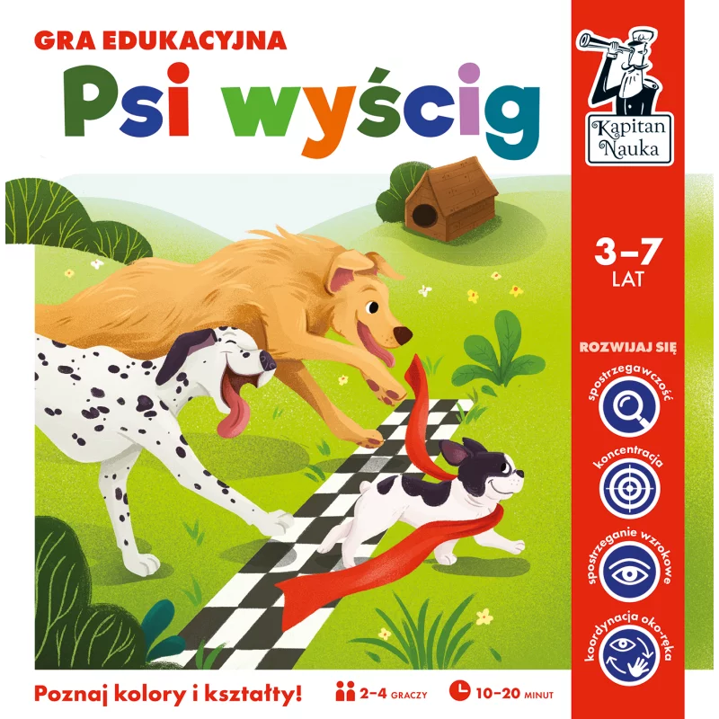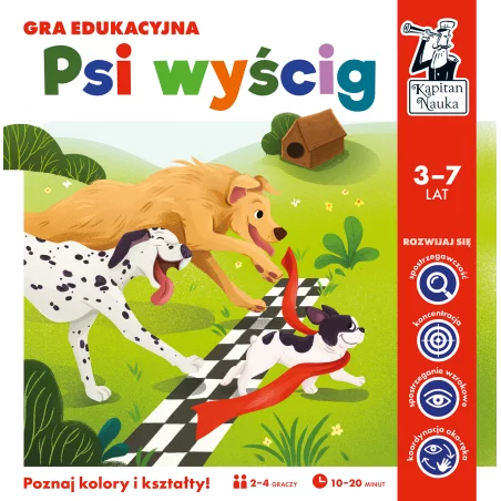 Psi wyścig to rodzinna gra planszowa, dzięki której mali gracze doskonalą znajomość podstawowych barw i kształtów, ścigając się o zwycięstwo. Zawodnicy mogą poruszyć się po polach z kształtem lub kolorem, który wypadł na jednej z kości – im więcej pól przeskoczą, tym lepiej. W rozgrywce liczą się więc nie tylko spostrzegawczość, lecz także umiejętność przeliczania i myślenia logicznego.