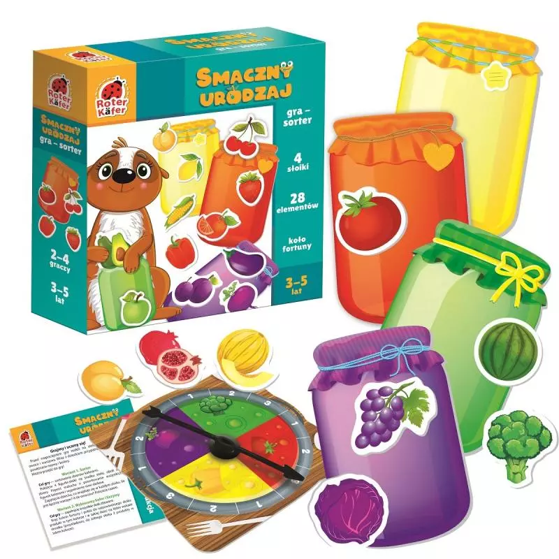 Komplet zawiera: 4 słoiki, 28 części, koło fortuny, instrukcję.