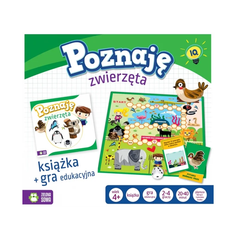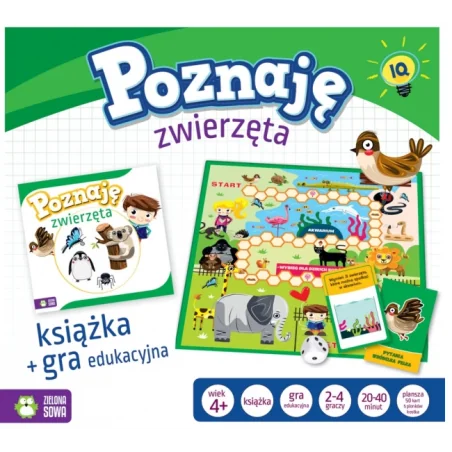 Poznaję zwierzęta to zestaw edukacyjny przeznaczony dla dzieci 4-6-letnich. Składa się z książki z ćwiczeniami, będącymi uzupełnieniem edukacji przedszkolnej i wczesnoszkolnej, oraz gry tematycznej.
