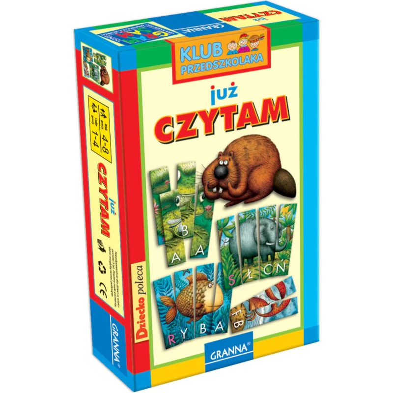 12 obrazków (każdy złożony z 4 elementów), książeczka z wierszykami do samodzielnego czytania, kostka, instrukcja.