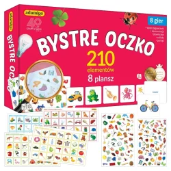 Bystre Oczko to edukacyjna gra obserwacyjna od renomowanej marki Adamigo, stworzona specjalnie dla najmłodszych dzieci w wieku przedszkolnym. Zestaw zawiera kolorowe ilustracje i proste zadania, które pomagają ćwiczyć spostrzegawczość, koncentrację i pamięć wzrokową. Idealna jako zabawa