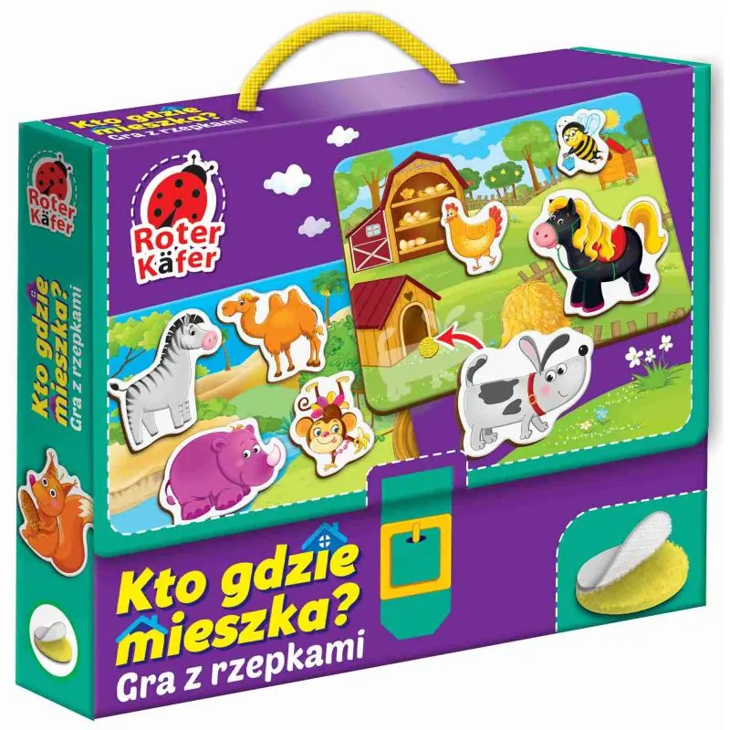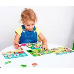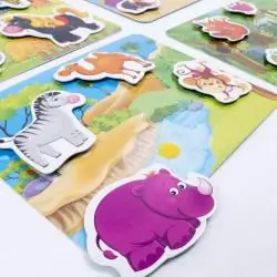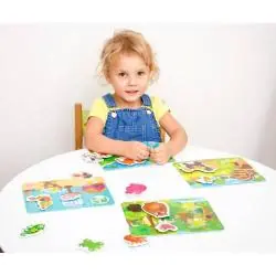 Przy pomocy rzepek umocuj każde zwierzątko do obrazka, który odpowiada miejscu jego zamieszkania. Przykładowo krówkę kierujemy do farmy, a wiewiórkę na drzewo. Ale to jeszcze nie wszystko. W każdym domku jest ulubione jedzonko zwierzątek. Dowiedz się, co uwielbiają pałaszować.Gra nie tylko będzie pomocna w poznawaniu pór roku, ale będzie też doskonałym ćwiczeniem na logikę i drobną motorykę mięśniową.