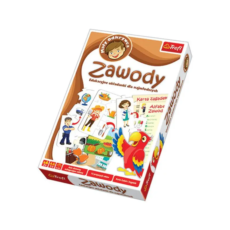 - opakowanie zawiera: 12 kartoników z wizerunkami przedstawicieli różnych zawodów; 36 puzzlowych klocków przedstawiających narzędzia pracy; planszetki z obrazkami miejsc pracy; dodatkową kartę zadań i zagadek