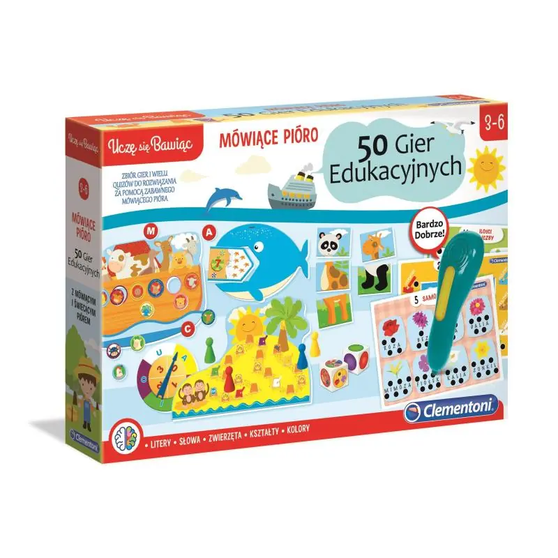 Odkryj interaktywną zabawkę, która wspiera rozwój dziecka przez zabawę! Mówiące pióro Clementoni z 50 grami edukacyjnymi to doskonałe narzędzie dla dzieci w wieku przedszkolnym i wczesnoszkolnym. Dzięki przyjaznemu głosowi lektora oraz kolorowym ilustracjom, nauka liter, cyfr, kształtów i logicznego myślenia staje się fascynującą przygodą. Idealne rozwiązanie dla rodziców i opiekunów szukających mądrego sposobu na połączenie zabawy z edukacją.