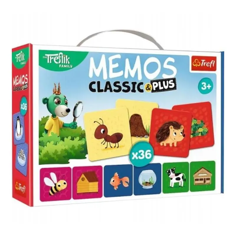 Trefl Memos Classic Plus Zwierzęta i ich Dom to rozwijająca gra edukacyjna, która pomaga dzieciom ćwiczyć pamięć, koncentrację i logiczne myślenie. Każda para kart przedstawia zwierzę oraz jego naturalne środowisko, dzięki czemu gra wspiera naukę poprzez