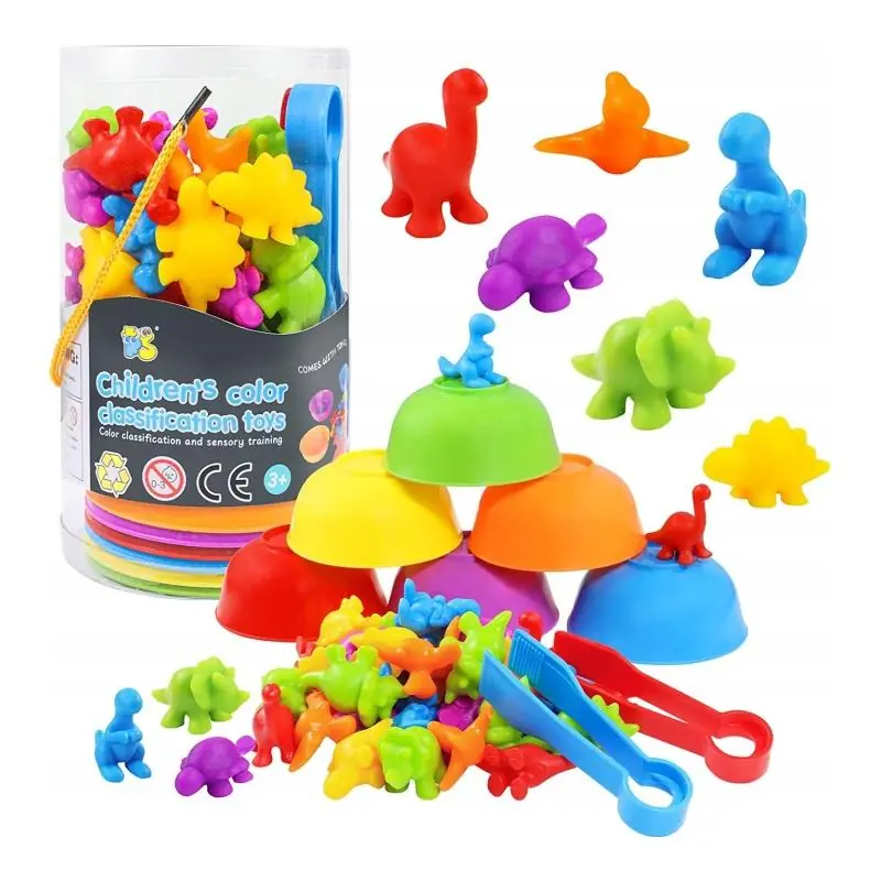 Dzięki dołączonym pęsetom dziecko może precyzyjnie przenosić figurki i umieszczać je w odpowiednich miseczkach według koloru lub kształtu. Zestaw edukacyjny do sortowania pomaga rozwijać koncentrację, koordynację ręka–oko oraz zdolności manualne.