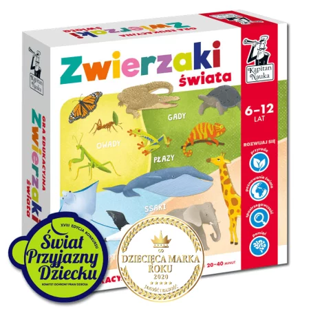 Gra edukacyjna „Zwierzaki świata” to fantastyczna przygoda dla dzieci w wieku 6–12 lat, w czasie której ścigają się o zwycięstwo, poznają zwierzęta z 6 królestw i ćwiczą spostrzegawczość oraz refleks.