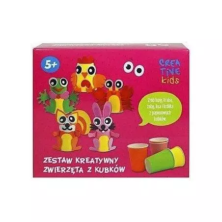 Oryginalny zestaw, który pozwoli wykreować kolorowe postacie zwierząt z kubków jednorazowych. W komplecie znajdują się elementy do wykonania pięciu zwierzaków: kury, kraba, żaby, lisa, królika.