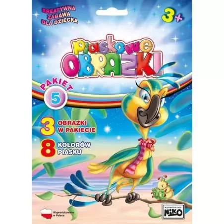 Piaskowe obrazki pakiet nr 5 to kreatywna zabawa dla dzieci, polegająca na tworzeniu barwnych ilustracji z piasku. Zestaw zawiera trzy obrazki: papugę, konia, motyla, 8 woreczków z kolorowym piaskiem oraz patyczek, za pomocą którego odkrywamy klejącą warstwę ilustracji. Przy tej zabawie wyobraźnia nie zna granic!