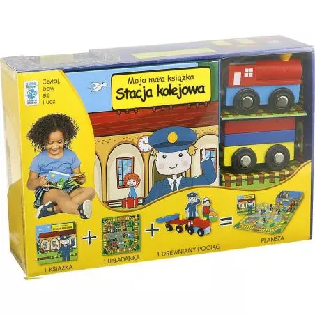 Szczegóły Witaj na stacji kolejowej! Zestaw aktywizujący zawiera:64-stronicową książeczkę, która opisuje wydarzenia na stacji kolejowej ,Drewniany pociąg ,Elementy z kartonu rozwijające wyobraźnię dziecka,16 części tworzących planszę o wymiarach 420x420 mm, Pudełko Przeczytaj książeczkę i stwórz własną stację kolejową. Zestaw zapewni małym kolejarzom wspaniałą zabawę!