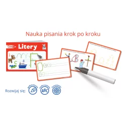 Uzupełnieniem książeczki są kolorowe, dwustronne karty ścieralne, na których znajduje się aż 60 zadań do rozwiązania. Rozpoczynają się od łamigłówek ćwiczących rękę w rysowaniu prostych szlaczków oraz rozwijających umiejętność pisania liter. Kolejne karty służą do nauki pisania prostych wyrazów. Dołączony do zestawu flamaster pozwala na zmazywanie i wielokrotne rozwiązywanie zadań.
