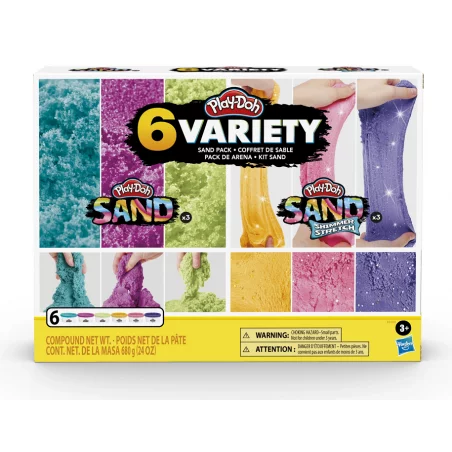 Z Play-Doh Sand możesz modelować dziwaczne kształty i dać się ponieść wyobraźni. Ściskaj, zgniataj, rozciągaj i przesypuj jak prawdziwy piasek. Kształtuj i formuj, jak tylko chcesz! Play-Doh Sand pobudza dziecięcą kreatywność, pozwala kształtować zdolności manualne. Zestaw zawiera 6 kolorowych tub Play-Doh Sand, w tym 3 tuby w kolorze: różowym, zielonym i turkusowym oraz 3 tuby o elastycznym i błyszczącym wyglądzie w kolorze żółtym, różowym i fioletowym. Ten miękki i plastyczny piasek daje wiele radości i nie sprawia żadnych kłopotów, jeśli chodzi o sprzątanie. Zabawa wciągnie każdego! Koniecznie sprawdź Play-Doh Sand!