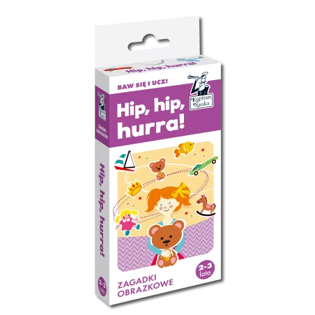 „Hip, hip, hurra! Zagadki obrazkowe” (2–3 lata) to bogato ilustrowana książeczka pełna ciekawych łamigłówek o codziennych sytuacjach dla najmłodszych dzieci. Zawiera niemal 180 zagadek na spostrzegawczość i logikę. Łamigłówki obrazkowe zostały opracowane przez psychologa w taki sposób, aby wspierać rozwój poznawczy i
