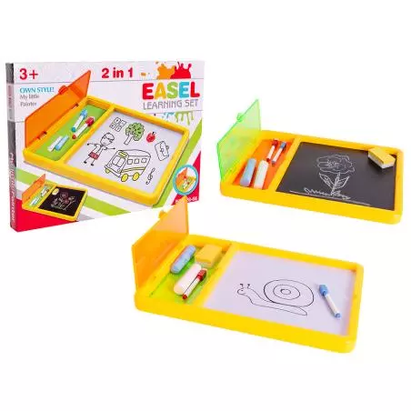 Tablica jest dwustronna - z jednej strony czarna do rysowaniu kredą, a z drugiej strony biała do rysowania pisakami suchościerlanymi.