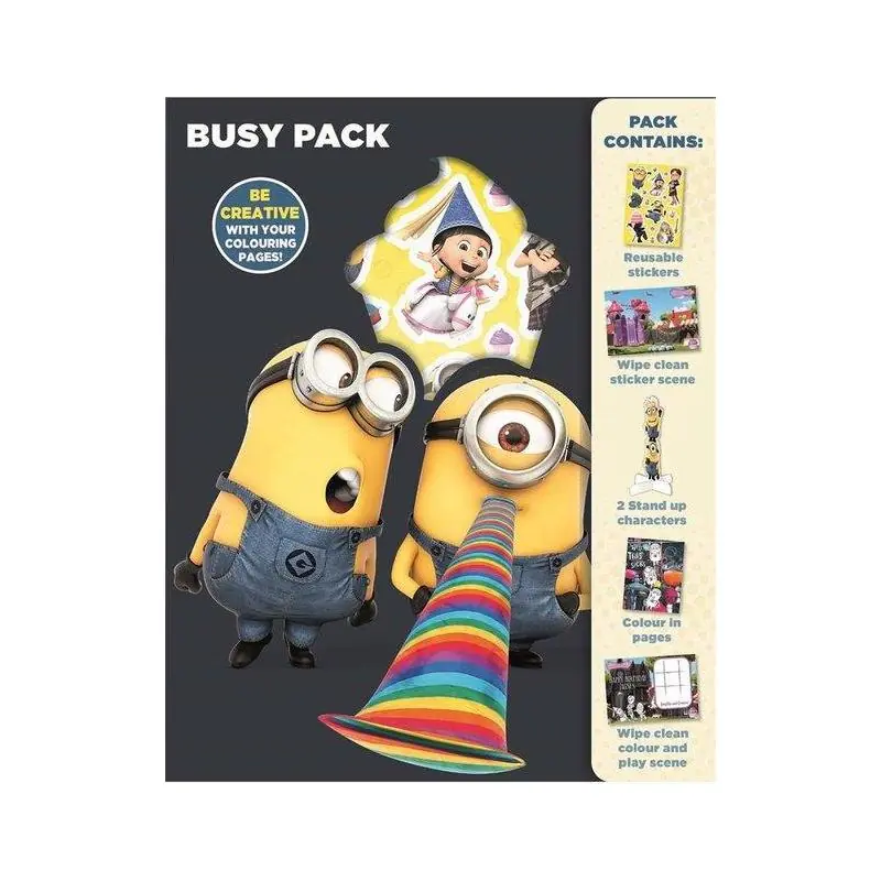 Zestaw zawiera arkusz z naklejkami, dwie "wypychanki" z postaciami minionków, planszę do gry w kółko i krzyżyk, 7 kolorowych scen do uzupełnienia (pokolorowania lub naklejenia naklejek).