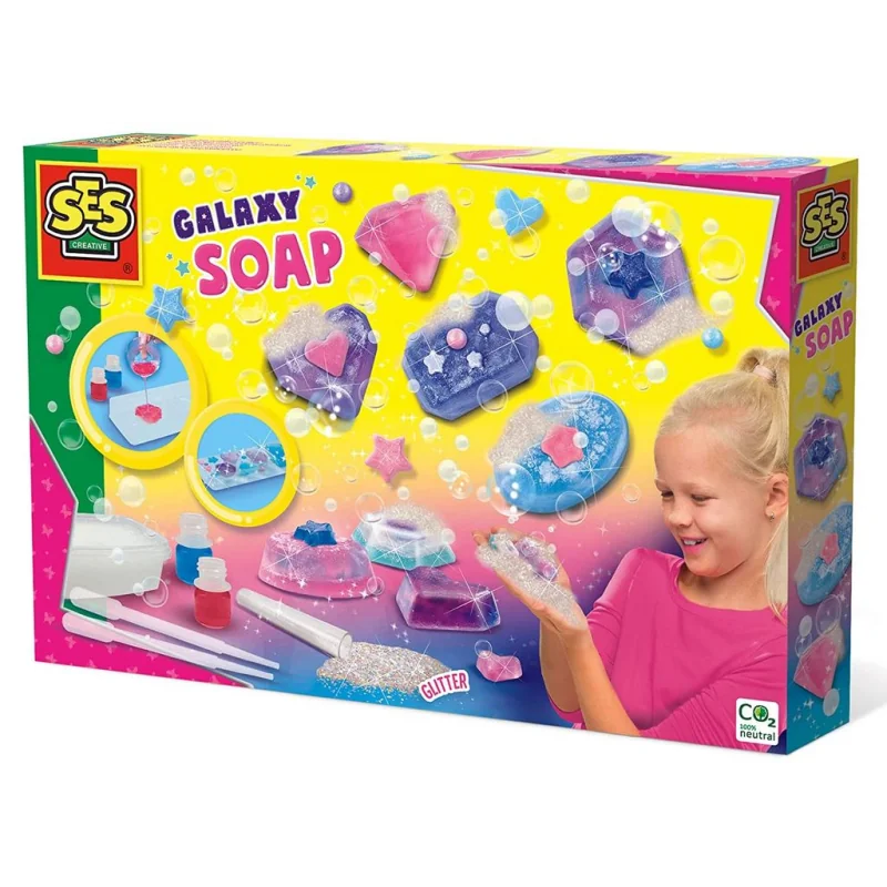 Stwórz własne mydło w galaktycznym stylu! Ten zestaw do odlewania mydła Galaxy od SES Creative zapewnia wyjątkowe doznania rzemieślnicze dla wszystkich zmysłów, ponieważ możesz samodzielnie tworzyć cudownie pachnące mydła. Najpierw rozpuść mydło w mikrofalówce, dodaj pipetą żądany barwnik, posyp brokatem, zamieszaj, a następnie wlej do foremki. Rezultatem są magiczne brokatowe mydła o wyglądzie gwiazd i diamentów. Wszystkie elementy zestawu są testowane pod względem kosmetycznym i całkowicie nieszkodliwe. Szczegółowy przewodnik wyjaśnia poszczególne kroki - nic nie może pójść źle!