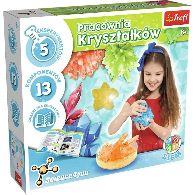 Science4you Pracownia Kryształków medium 61113 Trefl – zestaw naukowy, edukacyjny do przeprowadzania własnoręcznie 5 eksperymentów. Dowiedz się, jak zrobić krystaliczną gwiazdę, krystaliczne jajka oraz prześliczny naszyjnik z kryształów!