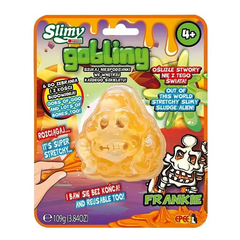 Ten straszny slime to nie tylko zabawka, ale również fascynująca przygoda, która ożywia oślizgłe potwory nie z tego świata. To, co najbardziej wyróżnia ten slime spośród innych to jego ukryta niespodzianka. Każdy zestaw zawiera szkielet, który można składać i rozkładać na 2 sposoby. Dzięki temu można stworzyć własnego strasznego goblina. W asortymencie 6 postaci goblinów: Frankie, Ropuch, Krabi, Żniwiarz, Rybol, Skała.