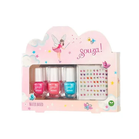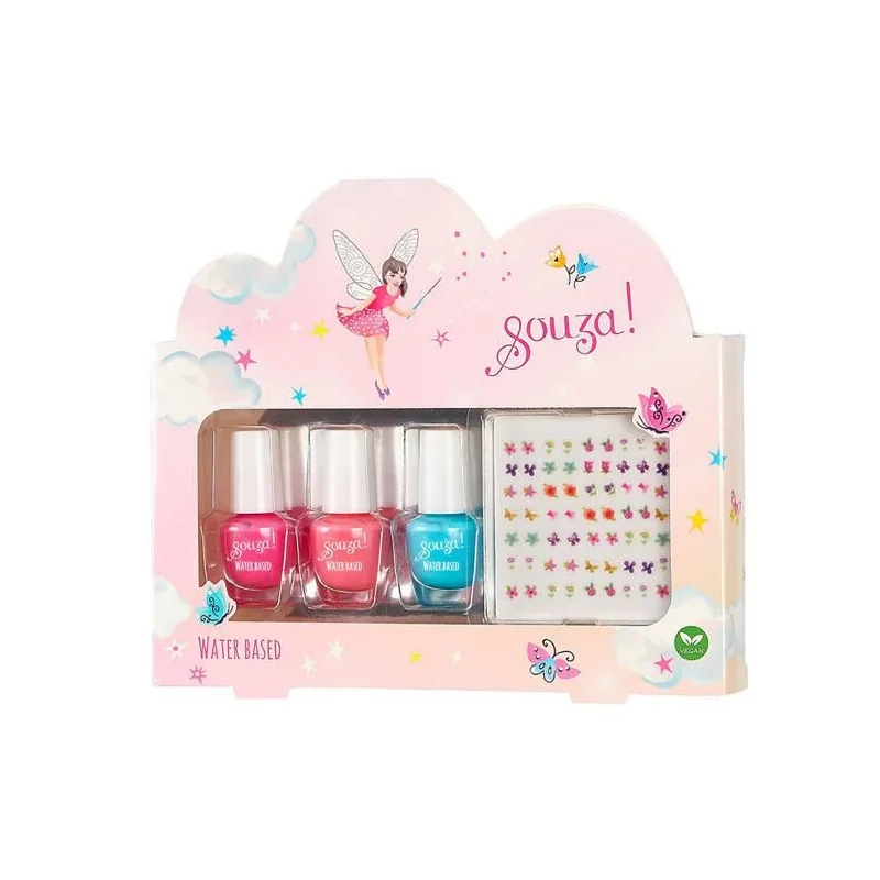 Zestaw lakierów do paznokci dla dzieci Elf holenderskiej marki Souza! W jego skład wchodzą 3 buteleczki lakierów w pięknych kolorach: różowym, morelowym i turkusowym oraz arkusz naklejek na paznokcie. Wykonane na bazie wody kosmetyki są w pełni bezpieczne, nie uczulają i nie podrażniają skóry. Tworzą na płytce warstwę peel-off, dzięki czemu bez trudu usuwa się je z paznokci (jak naklejki). Na arkuszu znajdują się 63 drobne naklejki – kwiatki i motylki, również z nietoksycznych materiałów. Idealne na przyjęcia, urodzinki, zabawę w salon kosmetyczny oraz jako stylowy prezent. Buteleczki mają po 4 ml pojemności. Całość zapakowana jest w urocze kartonowe pudełko z okienkiem.