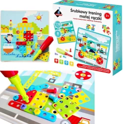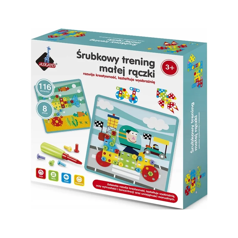 Śrubkowy Trening Małej Rączki Askato 3+ to doskonała propozycja dla dzieci, które uczą się precyzyjnych ruchów i koordynacji. Zabawka rozwija motorykę małą, pobudza ciekawość i zachęca do samodzielnej aktywności. Łączy naukę, zabawę i rozwój w jednym, bezpiecznym zestawie.