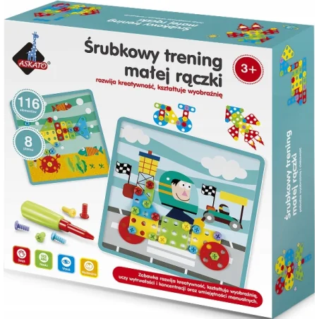 Śrubkowy Trening Małej Rączki Askato 3+ to kreatywna i edukacyjna zabawka manipulacyjna, która wspiera rozwój motoryki małej, koordynacji wzrokowo-ruchowej oraz logicznego myślenia. Dzięki kolorowym elementom do skręcania i dopasowywania, dziecko ćwiczy precyzję ruchów, cierpliwość i koncentrację,