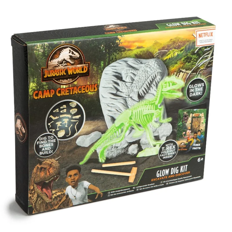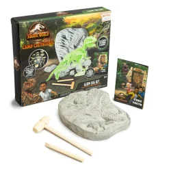 Jurassic World Camp Zestaw Wykopaliska Glow to wyjątkowy zestaw dla małych odkrywców, którzy marzą o zostaniu paleontologami. Pozwala na interaktywną zabawę, polegającą na wykopywaniu dinozaurów z bloczków świecących w ciemności. Zestaw łączy naukę z rozrywką,