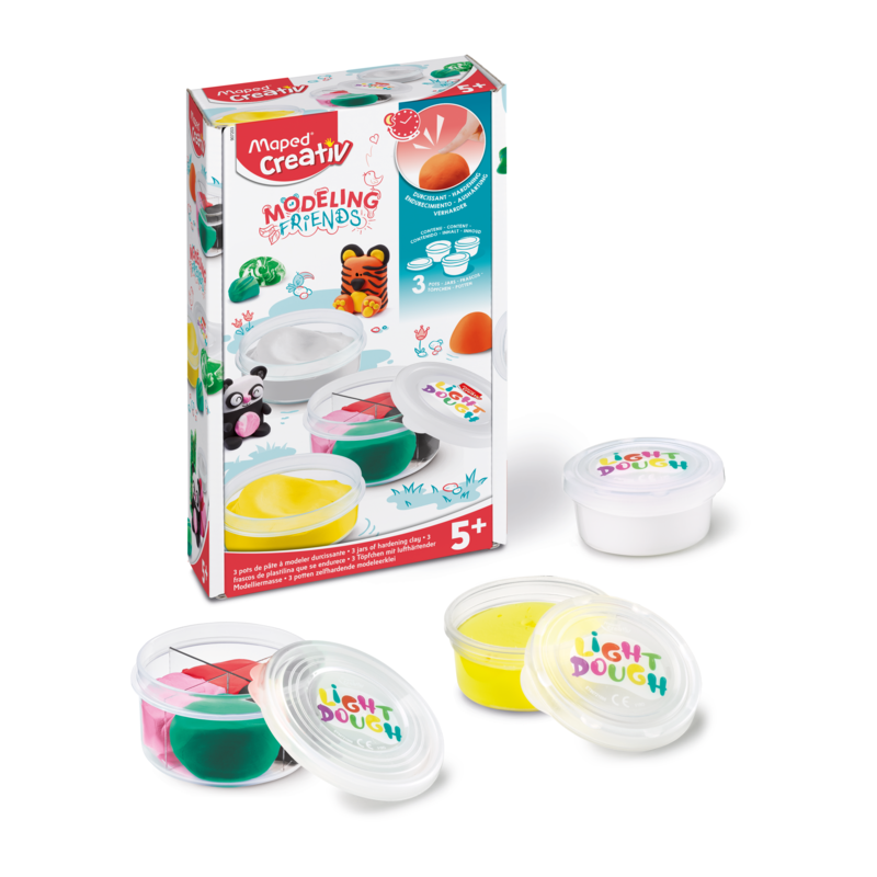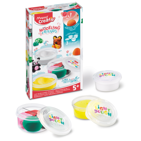 Masa plastyczna Maped Creativ Modeling Friends to samoutwardzalna, miękka i nieklejąca się masa plastyczna dla dzieci od piątego roku życia, idealna jako uzupełnienie zestawów Friends lub do samodzielnego tworzenia własnych projektów artystycznych. Materiał twardnieje naturalnie po kilku godzinach na powietrzu, bez potrzeby używania piekarnika czy kuchenki mikrofalowej, co zapewnia bezpieczną i wygodną zabawę. Zestaw wspiera rozwój kreatywności, zdolności manualnych oraz wyobraźni, umożliwiając dzieciom swobodne modelowanie i eksperymentowanie.
