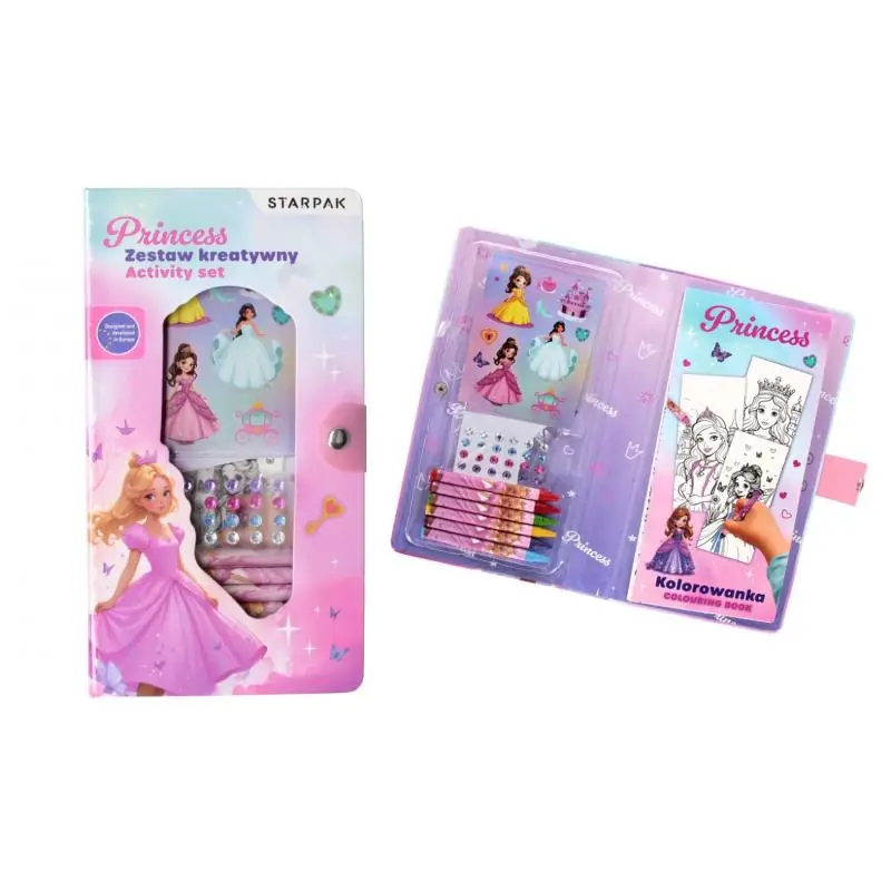 Zestaw kreatywny do kolorowania z kolekcji Starpak z serii Princess. Zestaw zawiera 1x kolorowanka, 6x kredki woskowe mix kolor, srebrne naklejki,24x diamenciki mix kolorów. Świetny pomysł na prezent, który rozwija umiejętności plastyczne dziecka. Zapoznaj się również z innymi produktami Starpak z kolekcji Princess Zestaw przeznaczony dla dzieci w