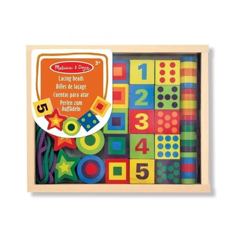 Zestaw dużych koralików Melissa & Doug sprawdzi się jako zabawka edukacyjna w domu, przedszkolu lub na zajęciach kreatywnych, wspierając rozwój manualny i logiczne myślenie dziecka.