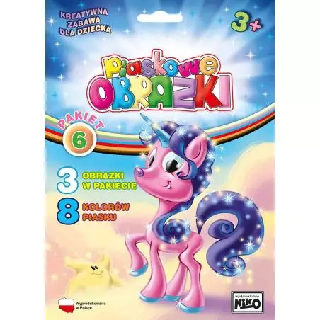 Piaskowe obrazki pakiet nr 6 to kreatywna zabawa dla dzieci, polegająca na tworzeniu barwnych ilustracji z piasku. Zestaw zawiera trzy obrazki: syrenkę, wróżkę, jednorożca, 8 woreczków z kolorowym piaskiem oraz patyczek, za pomocą którego odkrywamy klejącą warstwę ilustracji. Przy tej zabawie wyobraźnia nie zna granic!