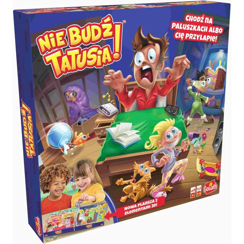 NOWA, ulepszona wersja Nie Budź Tatusia! Pudełko jest teraz planszą do gry! Przedostań się z pokoju dzieciaków przez pokój śpiącego Tatusia, do kuchni, aby podkraść smakowity czekoladowy Tort! Ale uważaj! Na Twojej drodze są hałaśliwe przeszkody , bądź czujny jeśli nie chcesz obudzić Tatusia i zostać złapany !