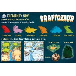 Draftozaur to lekka i szybka gra planszowa dla dzieci, rodzin i fanów dinozaurów, w której gracze budują własne parki jurajskie, rozmieszczając dinozaury według określonych zasad punktowania. Prosta mechanika draftu, piękne drewniane pionki i dynamiczna rozgrywka sprawiają, że to idealna gra dla